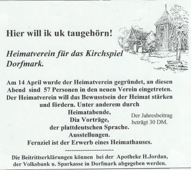 In Dorfmark hatte es schon 1976, und dann noch einmal 1981 Versuche gegeben, einen Heimatverein zu gründen, doch damals reichte die Anzahl der Interessierten noch nicht für eine Vereinsgründung. Das war am 14. April 2000 ganz anders. Der Abend war gut vorbereitet, und spontan traten 54 Personen dem neuen Verein bei, wählten einen Vorstand und verabschiedeten eine Satzung.